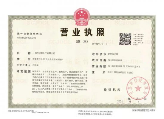 什邡市華蓉化工有限公司原名什邡華蓉科技有限責任公司,位于磷礦資源豐富的四川省什邡市,距成都60公里,交通運輸便利,是一家專業生產、研發精細磷化工系列產品的大型生產企業。生產設備先進,技術研發團隊強大,現公司占地面積約30000平方米,擁有5條生產線,主要生產大量元素水溶肥、磷酸二氫鉀、磷酸二氫銨、磷酸氫二銨、硝酸鉀、磷酸脲以及磷酸,年總產量為100000噸以上。公司資質齊全,管理規范,已取得安全生產許可證、ISO9001:2015質量管理體系認證、食品生產許可證、工業產品生產許可證、自營進出口經營權進出口證書以及出口歐盟國家部分產品的REACH證書。